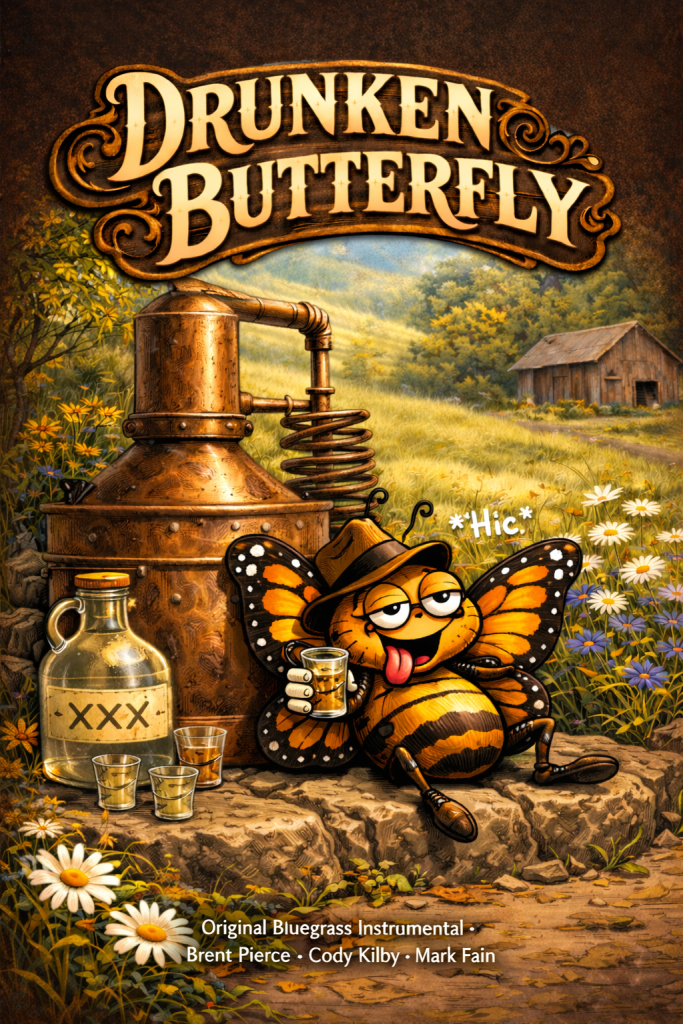 “Drunken Butterfly” is an original composition by Brent Pierce, rooted firmly in the traditional bluegrass tradition. Built around a lively call and answer exchange between banjo and guitar, the tune captures the playful drive and rhythmic snap that define classic mountain music.